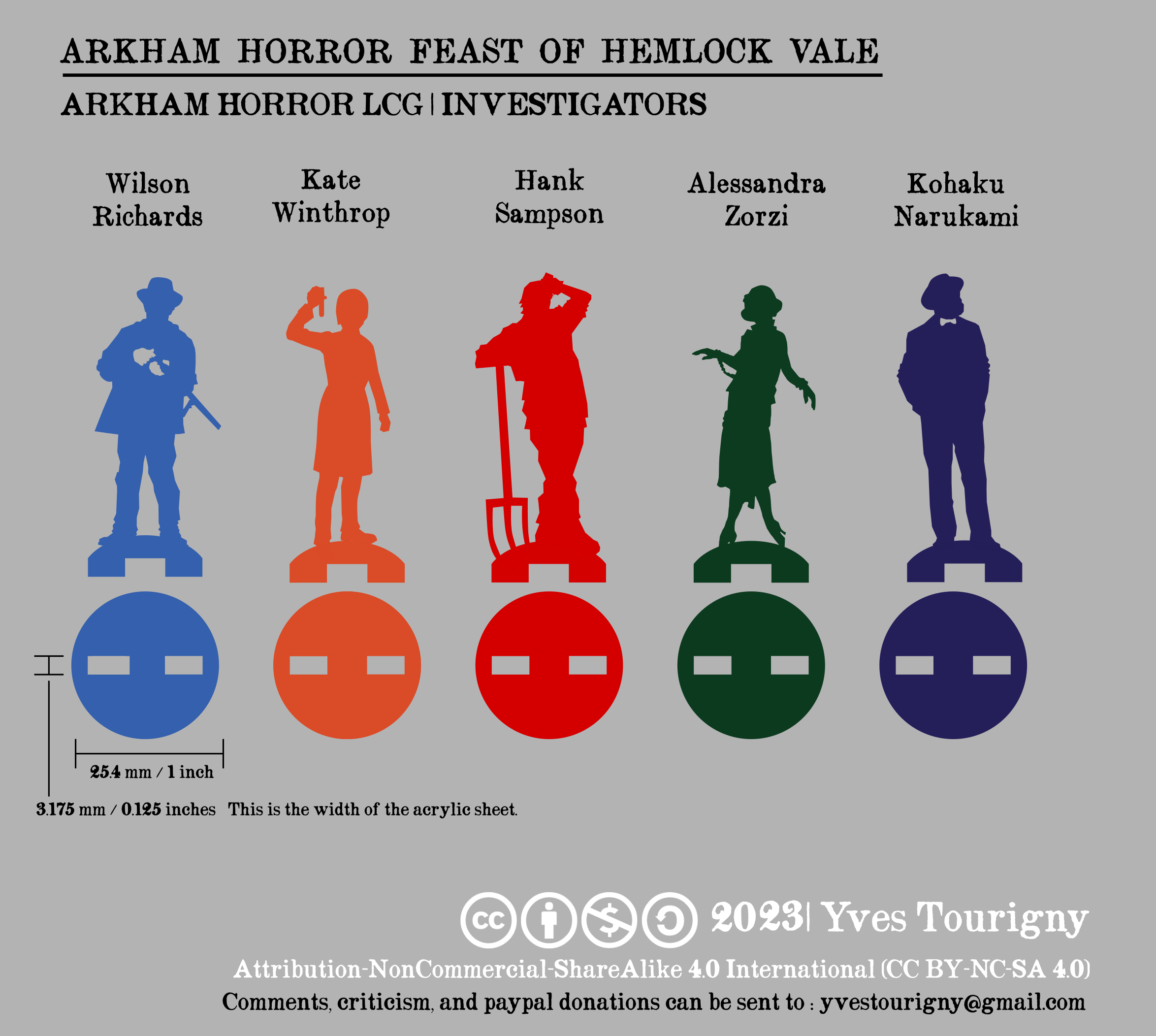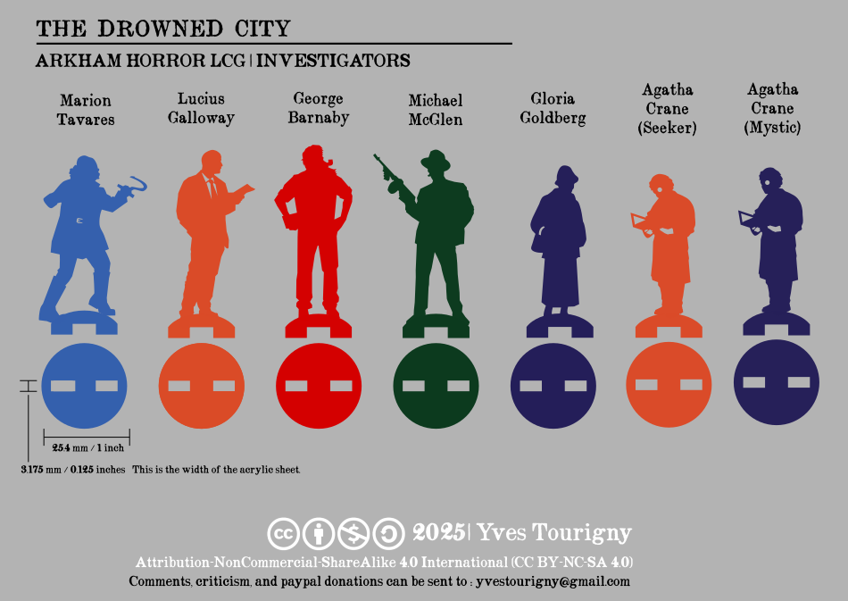 Custom laser-cut acrylic investigators for the Arkham Horror Living Card Game.